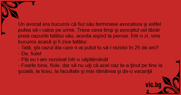 Un avocat era bucuros că fiul său terminase avocatura şi astfel putea să-i calce pe urme. Trece ceva timp şi avocatul cel tânăr preia cazurile tatălui său, acesta ieşind la pensie. Într-o zi, vine bucuros acasă şi îi zice tatălui:
