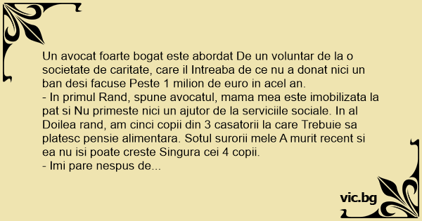 Un avocat foarte bogat este abordat De un voluntar de la o societate de caritate, care il Intreaba de ce nu a donat nici un ban desi facuse Peste 1 milion de euro in acel an.