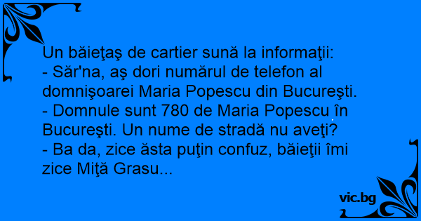 - Săr'na, aş dori numărul de telefon al domnişoarei Maria Popescu din Bucureşti.