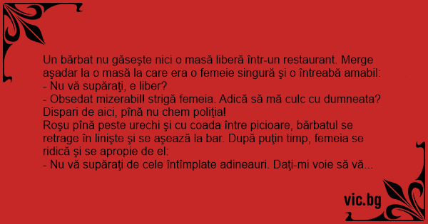 Un bărbat nu găseşte nici o masă liberă într-un restaurant. Merge aşadar la o masă la care era o femeie singură şi o întreabă amabil: