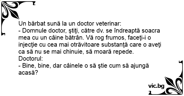 - Domnule doctor, ştiţi, către dv. se îndreaptă soacra mea cu un câine bătrân. Vă rog frumos, faceţi-i o injecţie cu cea mai otrăvitoare substanţă care o aveţi ca să nu se mai chinuie, să moară repede.