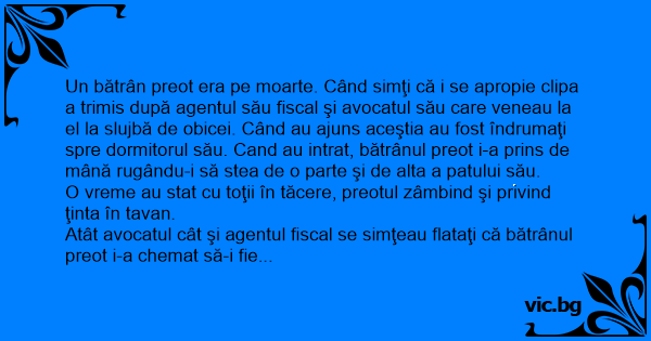 Un bătrân preot era pe moarte. Când simţi că i se apropie clipa a trimis după agentul său fiscal şi avocatul său care veneau la el la slujbă de obicei. Când au ajuns aceştia au fost îndrumaţi spre dormitorul său. Cand au intrat, bătrânul preot i-a prins de mână rugându-i să stea de o parte şi de alta a patului său.