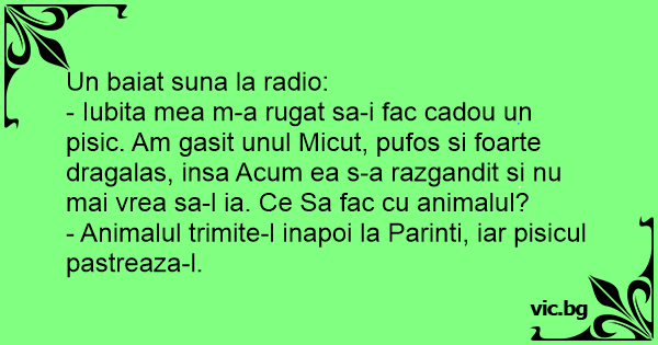 - Iubita mea m-a rugat sa-i fac cadou un pisic. Am gasit unul Micut, pufos si foarte dragalas, insa Acum ea s-a razgandit si nu mai vrea sa-l ia. Ce Sa fac cu animalul?