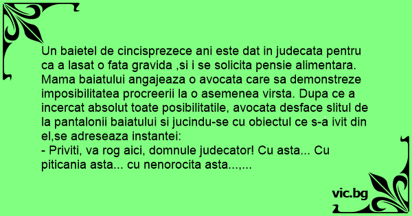 Un baietel de cincisprezece ani este dat in judecata pentru ca a lasat o fata gravida ,si i se solicita pensie alimentara. Mama baiatului angajeaza o avocata care sa demonstreze imposibilitatea procreerii la o asemenea virsta. Dupa ce a incercat absolut toate posibilitatile, avocata desface slitul de la pantalonii baiatului si jucindu-se cu obiectul ce s-a ivit din el,se adreseaza instantei: