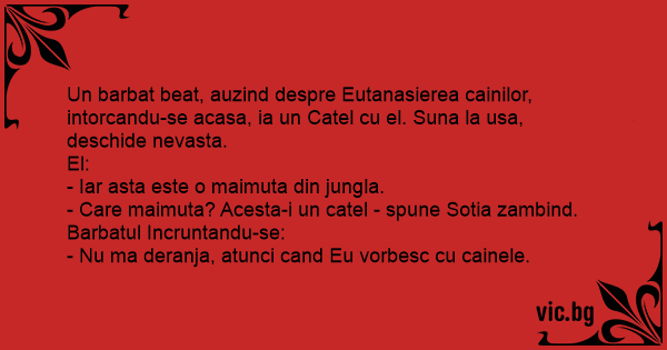 Un barbat beat, auzind despre Eutanasierea cainilor, intorcandu-se acasa, ia un Catel cu el. Suna la usa, deschide nevasta.
