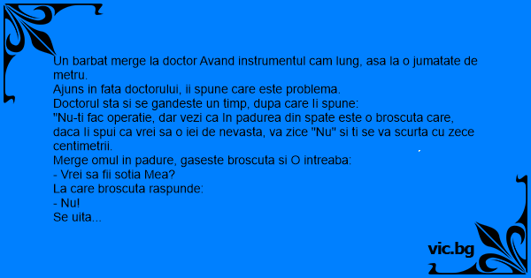 "Nu-ti fac operatie, dar vezi ca In padurea din spate este o broscuta care, daca Ii spui ca vrei sa o iei de nevasta, va zice "Nu" si ti se va scurta cu zece centimetrii.