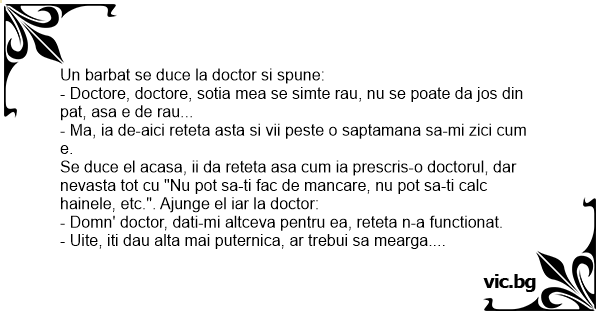 Se duce barbatul acasa, dar nici un rezultat, ea tot la pat era. Asa ca se duce barbatul nostru pentru a treia oara la doctor si se roaga de el sa-i dea alta reteta. Doctorul nostru ii da doua palme si-i spune: