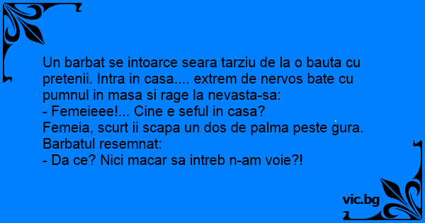 Un barbat se intoarce seara tarziu de la o bauta cu pretenii. Intra in casa.... extrem de nervos bate cu pumnul in masa si rage la nevasta-sa: