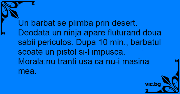 Un barbat se plimba prin desert. Deodata un ninja apare fluturand doua sabii periculos. Dupa 10 min., barbatul scoate un pistol si-l impusca.