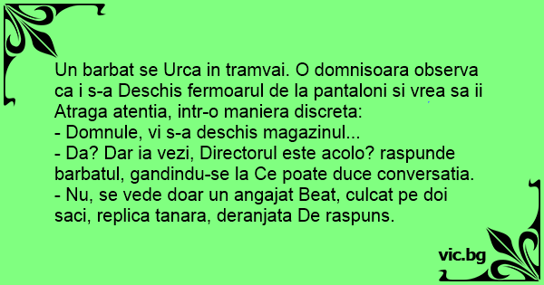 Un barbat se Urca in tramvai. O domnisoara observa ca i s-a Deschis fermoarul de la pantaloni si vrea sa ii Atraga atentia, intr-o maniera discreta: