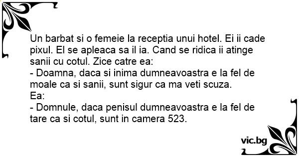 - Domnule, daca penisul dumneavoastra e la fel de tare ca si cotul, sunt in camera 523.