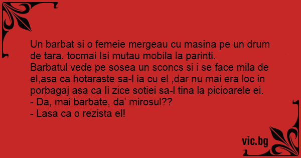 Barbatul vede pe sosea un sconcs si i se face mila de el,asa ca hotaraste sa-l ia cu el ,dar nu mai era loc in porbagaj asa ca Ii zice sotiei sa-l tina la picioarele ei.