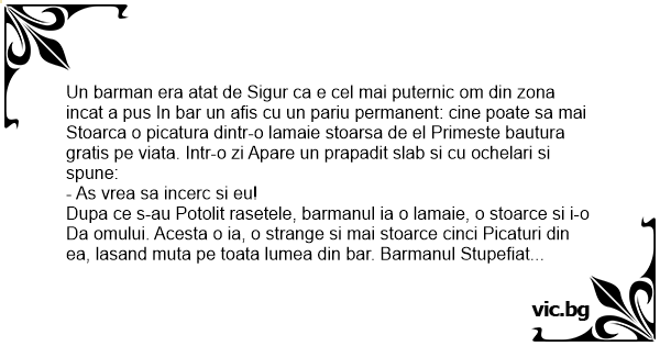 Un barman era atat de Sigur ca e cel mai puternic om din zona incat a pus In bar un afis cu un pariu permanent: cine poate sa mai Stoarca o picatura dintr-o lamaie stoarsa de el Primeste bautura gratis pe viata. Intr-o zi Apare un prapadit slab si cu ochelari si spune: