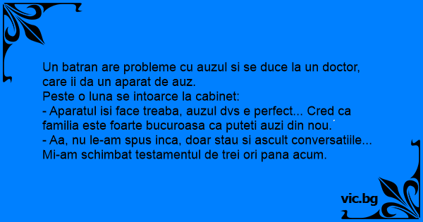 Un batran are probleme cu auzul si se duce la un doctor, care ii da un aparat de auz.