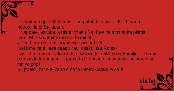 Un batran cap al Mafiei este pe patul de moarte. Isi cheama nepotul la el Si-i spune: