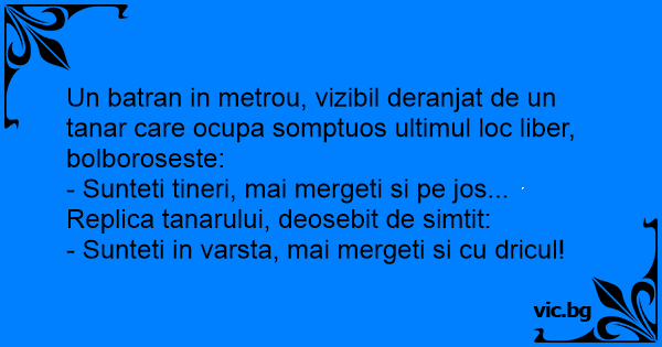 Un batran in metrou, vizibil deranjat de un tanar care ocupa somptuos ultimul loc liber, bolboroseste: