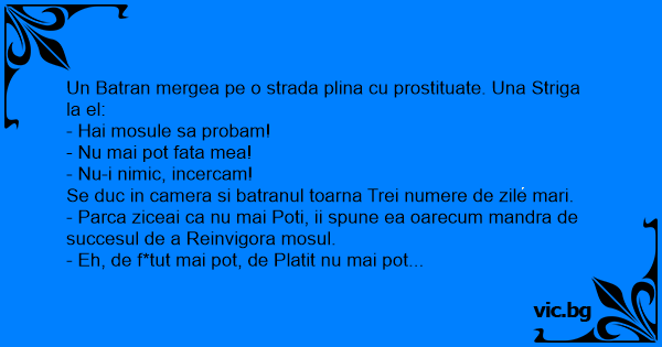 Un Batran mergea pe o strada plina cu prostituate. Una Striga la el: