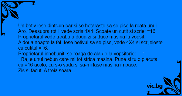 Zis si facut. A treia seara iese betivul la pisat si vede: 4X4=16, dupa care scoate cutitul si scrie CORECT.