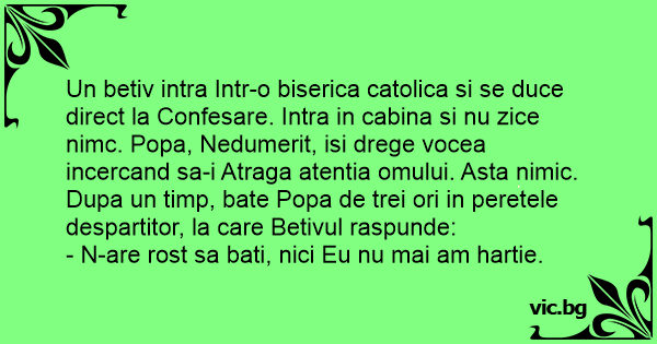 Un betiv intra Intr-o biserica catolica si se duce direct la Confesare. Intra in cabina si nu zice nimc. Popa, Nedumerit, isi drege vocea incercand sa-i Atraga atentia omului. Asta nimic. Dupa un timp, bate Popa de trei ori in peretele despartitor, la care Betivul raspunde: