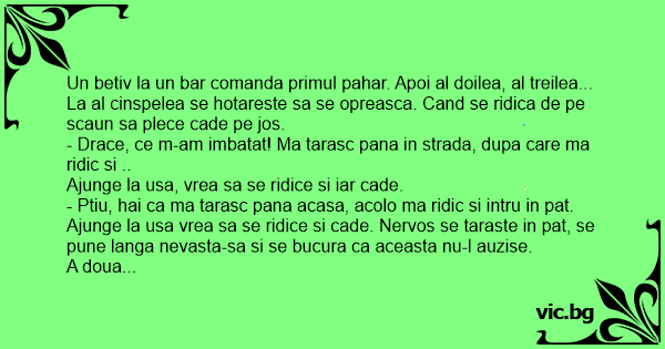 Un betiv la un bar comanda primul pahar. Apoi al doilea, al treilea... La al cinspelea se hotareste sa se opreasca. Cand se ridica de pe scaun sa plece cade pe jos.