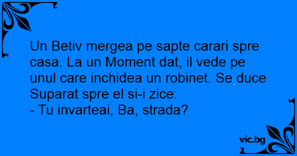 Un Betiv mergea pe sapte carari spre casa. La un Moment dat, il vede pe unul care inchidea un robinet. Se duce Suparat spre el si-i zice: