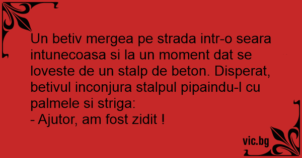 Un betiv mergea pe strada intr-o seara intunecoasa si la un moment dat se loveste de un stalp de beton. Disperat, betivul inconjura stalpul pipaindu-l cu palmele si striga: