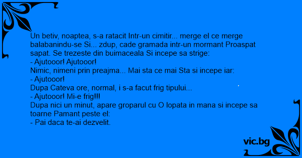 Un betiv, noaptea, s-a ratacit Intr-un cimitir... merge el ce merge balabanindu-se Si... zdup, cade gramada intr-un mormant Proaspat sapat. Se trezeste din buimaceala Si incepe sa strige: