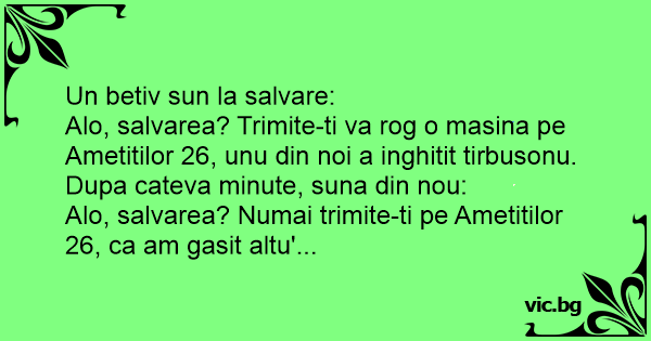 Alo, salvarea? Trimite-ti va rog o masina pe Ametitilor 26, unu din noi a inghitit tirbusonu.