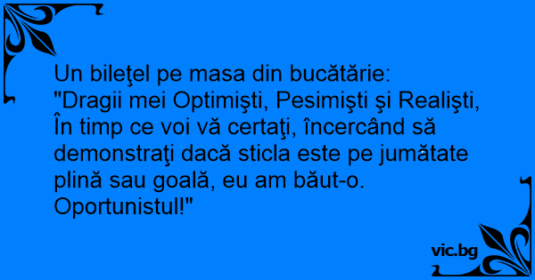 "Dragii mei Optimişti, Pesimişti şi Realişti, În timp ce voi vă certaţi, încercând să demonstraţi dacă sticla este pe jumătate plină sau goală, eu am băut-o.