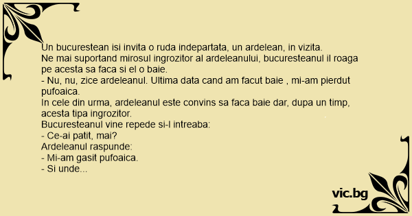 - Nu, nu, zice ardeleanul. Ultima data cand am facut baie , mi-am pierdut pufoaica.