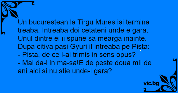 Un bucurestean la Tirgu Mures isi termina treaba. Intreaba doi cetateni unde e gara. Unul dintre ei ii spune sa mearga inainte. Dupa citiva pasi Gyuri il intreaba pe Pista: