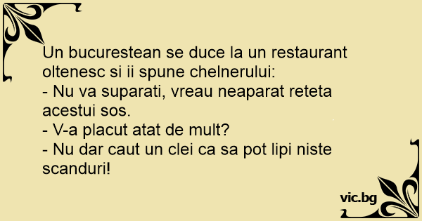 Un bucurestean se duce la un restaurant oltenesc si ii spune chelnerului: