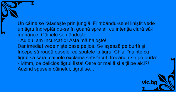 Un câine se rătăceşte prin junglă. Plimbându-se el liniştit vede un tigru îndreptându-se în goană spre el, cu intenţia clară să-l mănânce. Câinele se gândeşte: