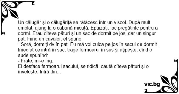 - Soră, dormiţi dv în pat. Eu mă voi culca pe jos în sacul de dormit.