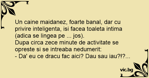 Un caine maidanez, foarte banal, dar cu privire inteligenta, isi facea toaleta intima (adica se lingea pe ... jos).