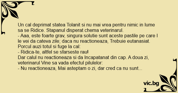 Un cal deprimat statea Tolanit si nu mai vrea pentru nimic in lume sa se Ridice. Stapanul disperat chema veterinarul.