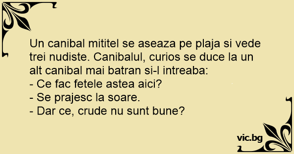 Un canibal mititel se aseaza pe plaja si vede trei nudiste. Canibalul, curios se duce la un alt canibal mai batran si-l intreaba: