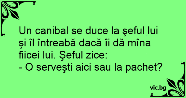 Un canibal se duce la şeful lui şi îl întreabă dacă îi dă mîna fiicei lui. Şeful zice: