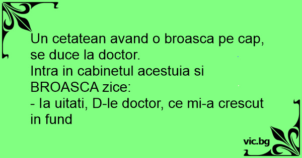 Un cetatean avand o broasca pe cap, se duce la doctor.