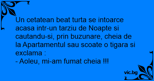 Un cetatean beat turta se intoarce acasa intr-un tarziu de Noapte si cautandu-si, prin buzunare, cheia de la Apartamentul sau scoate o tigara si exclama :