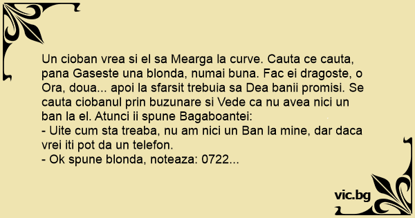 Un cioban vrea si el sa Mearga la curve. Cauta ce cauta, pana Gaseste una blonda, numai buna. Fac ei dragoste, o Ora, doua... apoi la sfarsit trebuia sa Dea banii promisi. Se cauta ciobanul prin buzunare si Vede ca nu avea nici un ban la el. Atunci ii spune Bagaboantei: