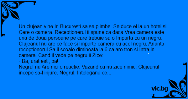 Un clujean vine In Bucuresti sa se plimbe. Se duce el la un hotel si Cere o camera. Receptionerul ii spune ca daca Vrea camera este una de doua persoane pe care trebuie sa o Imparta cu un negru. Clujeanul nu are ce face si Imparte camera cu acel negru. Anunta receptionerul Sa il scoale dimineata la 6 ca are tren si Intra in camera. Cand il vede pe negru ii Zice: