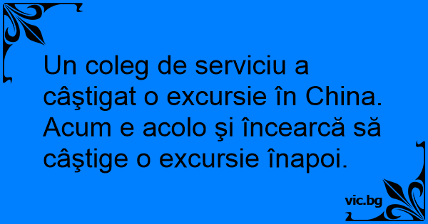 Un coleg de serviciu a câştigat o excursie în China. Acum e acolo şi încearcă să câştige o excursie înapoi.