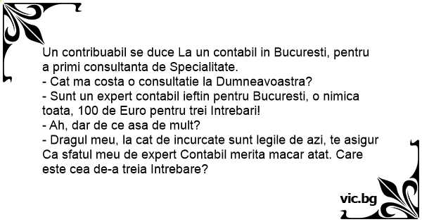 - Dragul meu, la cat de incurcate sunt legile de azi, te asigur Ca sfatul meu de expert Contabil merita macar atat. Care este cea de-a treia Intrebare?