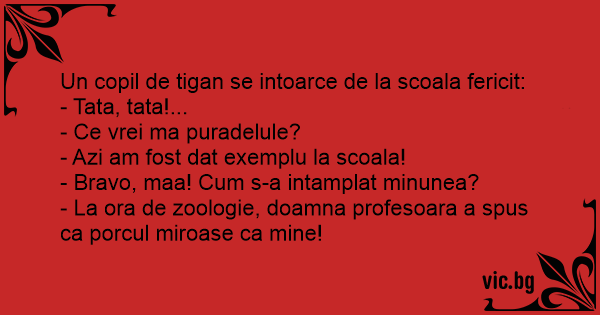 - La ora de zoologie, doamna profesoara a spus ca porcul miroase ca mine!
