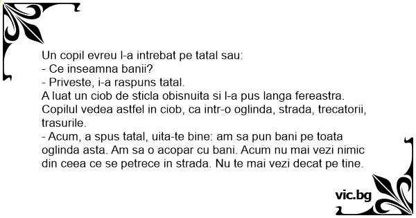- Acum, a spus tatal, uita-te bine: am sa pun bani pe toata oglinda asta. Am sa o acopar cu bani. Acum nu mai vezi nimic din ceea ce se petrece in strada. Nu te mai vezi decat pe tine.