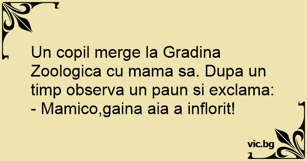 Un copil merge la Gradina Zoologica cu mama sa. Dupa un timp observa un paun si exclama:
