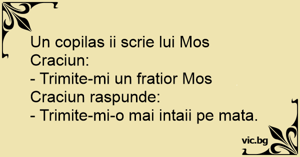 Bula, la 5 ani ii trimite scrisoare mosului de Craciun: ,,Draga Mosule, vreau sa am un fratior mai mic'' Mosul o citeste, si ii trimite lui Bula o alta scrisoare: ,,Atunci trimite-mi-o pe mamica ta!''