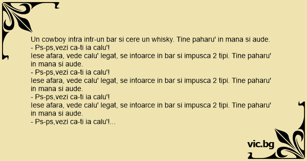 Un cowboy intra intr-un bar si cere un whisky. Tine paharu' in mana si aude.