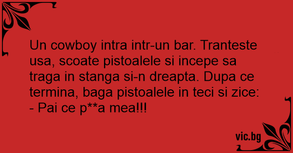 Un cowboy intra intr-un bar. Tranteste usa, scoate pistoalele si incepe sa traga in stanga si-n dreapta. Dupa ce termina, baga pistoalele in teci si zice: